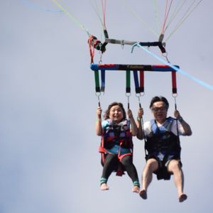 First, two young women took off, followed by the foreign couple, and everyone seemed to be handling it well. Finally, it was our turn; we attached the parachute to our life jackets and, in no time, we were 90 meters up. There was no wind at that height, and the view of the truly blue ocean below was amazing. In the end, we dipped our lower bodies into the water. The flying time was about 10 to 15 minutes. It was not scary at all and was the best moment!