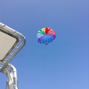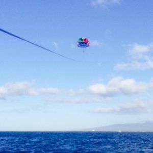 I tried parasailing for the first time. I went higher than I expected, which was a bit scary, but the strange feeling of flying in the blue sky and the fun of it outweighed my fear. I want to try it again.
