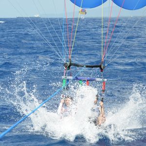 We participated with our 13-year-old and 11-year-old children. We made a reservation online from Japan and had no idea what to expect. However, a car picked us up at the hotel and took us to the port, where we boarded the boat right away. We joined other foreigners who had signed up directly on-site and took off as parent-child pairs. Once the boat moved out to sea, we put on life jackets and strapped on the equipment, then soared into the sky all at once. The thrill was incredible! We floated in the air for about five minutes, and as we were being lowered while the rope was reeled in, we landed back on the boat. I was amazed at how easily we could fly! The kids enjoyed it very much and weren't scared at all.