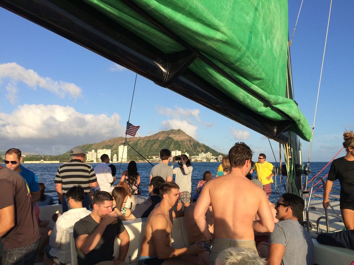 On the evening of our arrival in Honolulu, we boarded the Mai Tai Catamaran. A nice breeze was blowing, and it was perfect cruising weather with big waves. We thoroughly enjoyed a wonderful sunset with cocktails in hand, accompanied by a lively crew and great background music. I will definitely ride again!