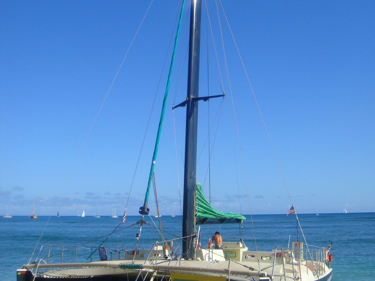 今年は昨年乗ったのとちがうこのマイタイカタマラン号をチョイスしました。出発場所はシェラトンワイキキの裏側とちょっと分かりにくかったのですが、幸いかどうかわかりませんが、乗りあった人たちが、外人の方も含め非常に良い方たちばかりで、みんなで和気あいあいと写真を撮り合ったりと非常に楽しい時間を過ごせました。またワイキキに来たら必ずオプションしたいと思います。