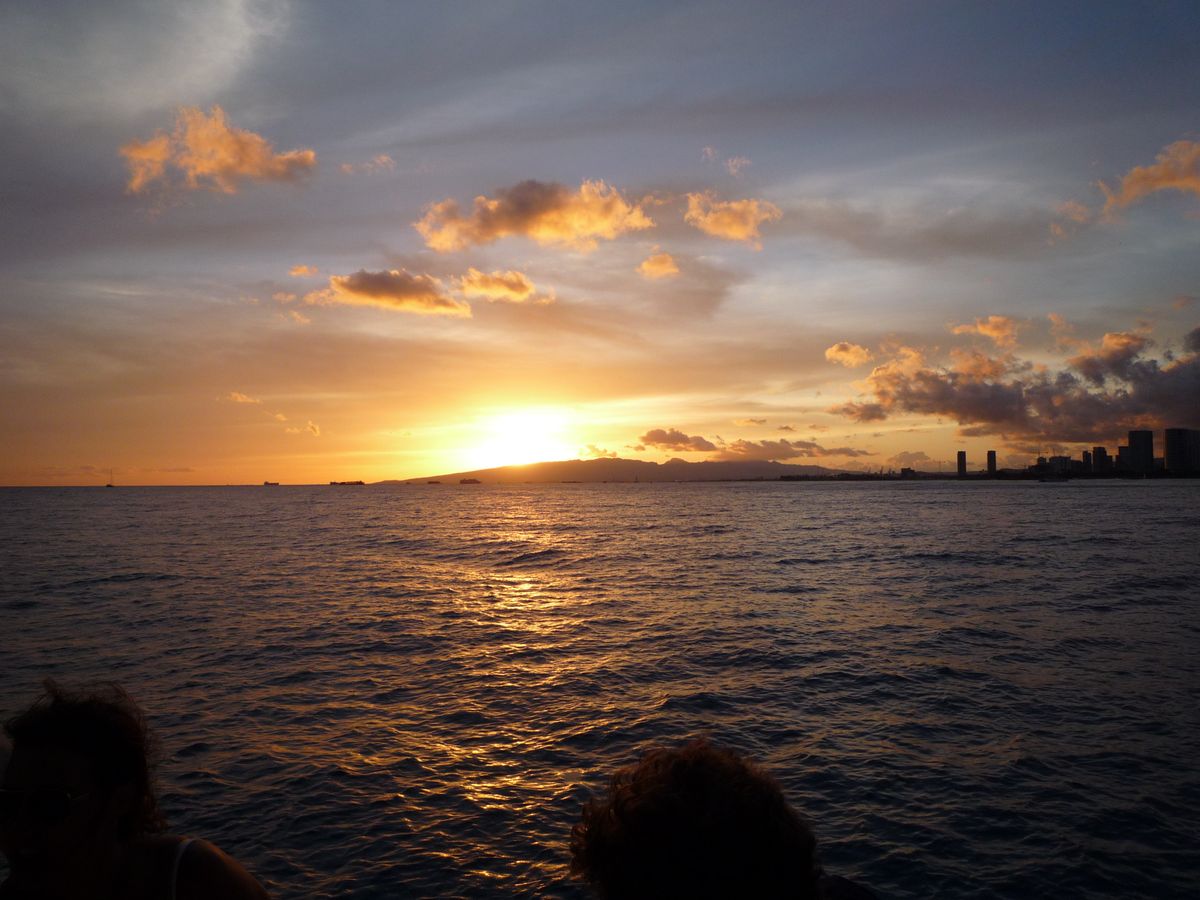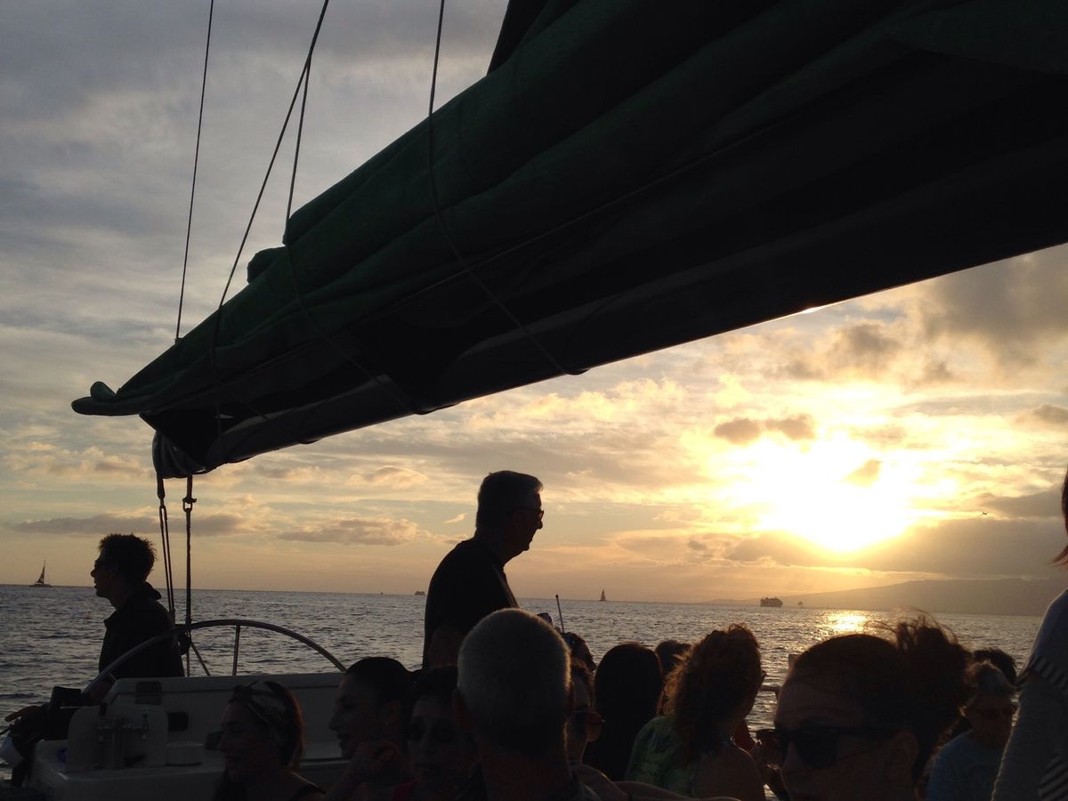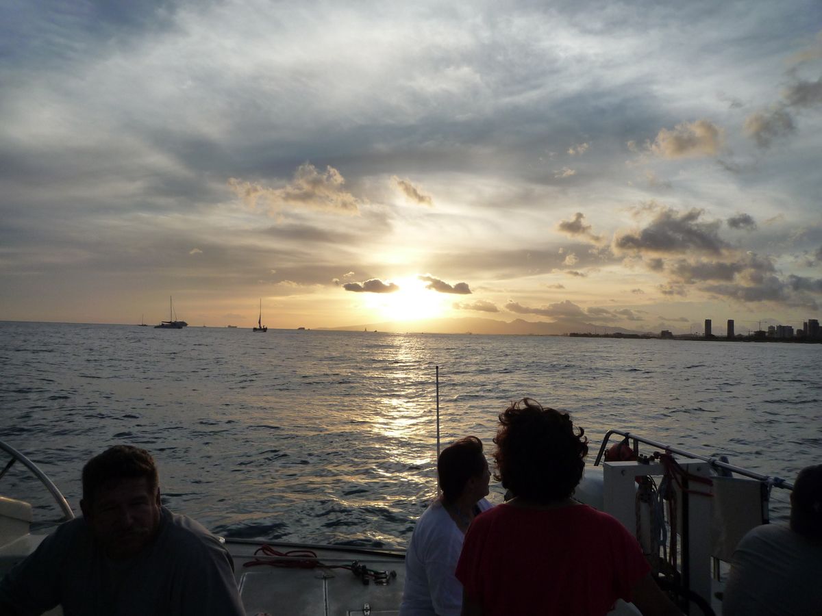 海を近くに感じられるカタマラン号の良さは,昨年昼間にホヌやイルカに出会うというラッキーもあって,経験済みでした。今年は,美しい夕陽を見たいと参加しました。出航時は雲が多く,夕陽は見られるかしらと心配しましたが,ほどなく晴れ,二時間ばかりのセーリングを楽しみました。夕陽に照らされて刻々と変わっていくワイキキやダイアモンドヘッド等の風景,どこまでも碧く藍色の海,そして日の入り時に一層まばゆく輝く夕陽の美しさ。日本人は,私達だけという完全アウェイ状態のカタマラン号の中でしたが,人種は違っても,美しい夕陽に共に感動したり,写真を取り合ったりと平和の良さもしみじみ感じました。(昼間,パールハーバーを訪れていたので。)飲み物はFreeドリンク。マイタイ,ソフトドリンク飲み放題。(ABCストアで買ったおつまみ持参しました。)外国の方達は平気そうでしたが,海上はとても肌寒く,長袖持参していて良かったです。(次回参加することがあれば,靴下も持って行くつもりです。)クルーの方達は英語のみなので,トイレの説明をされたようですが,よく分からず・・・。どうやら蓋を開けて下に行って用を足していました。(私達は,口コミのアドバイス通りに,乗船間際にトイレを済ませておきました。)夕陽が沈み,シェラトンの浜辺に帰る頃は,辺り一面ピンク色に染まり,夢のような美しい思い出になりました。下船時にチップを入れる箱がありました。少しのお金を持参されるのが良いかなと思います。