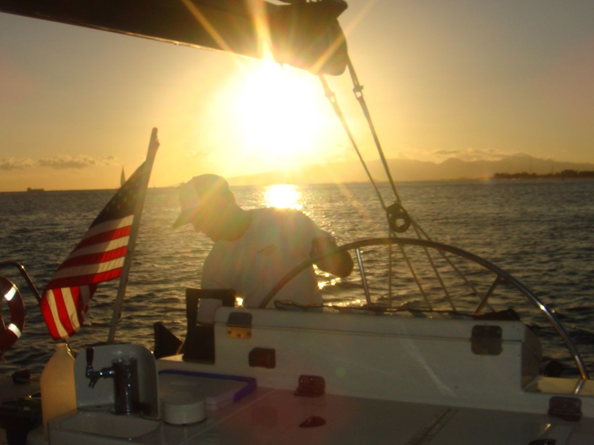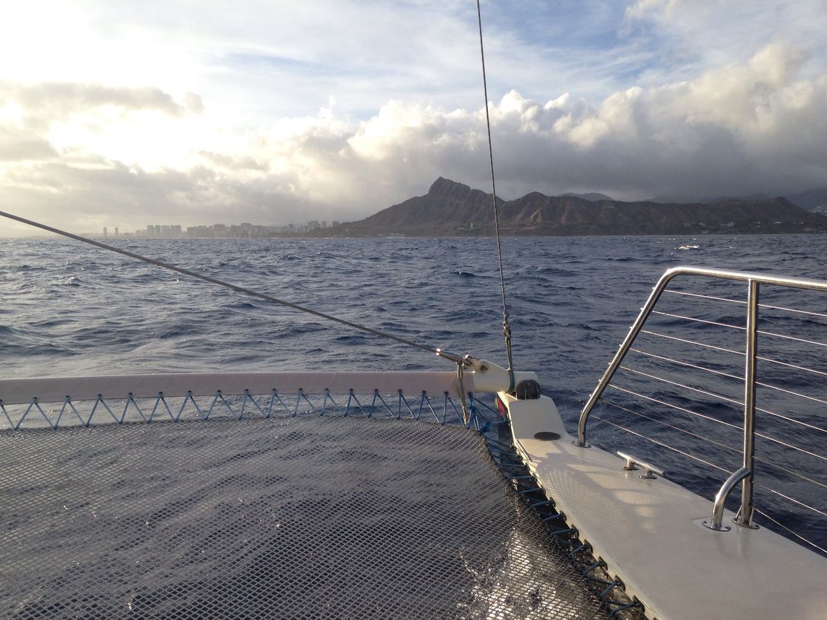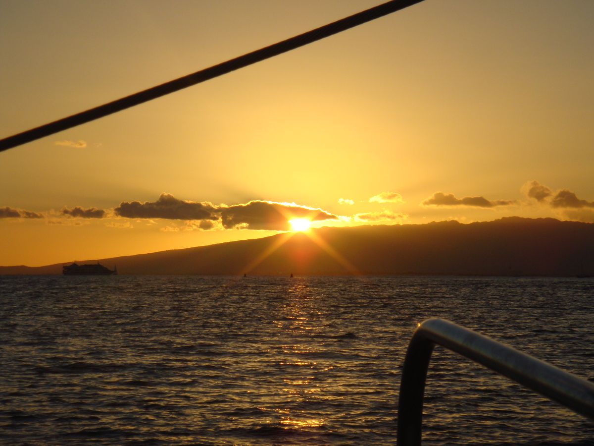 海を近くに感じられるカタマラン号の良さは,昨年昼間にホヌやイルカに出会うというラッキーもあって,経験済みでした。今年は,美しい夕陽を見たいと参加しました。出航時は雲が多く,夕陽は見られるかしらと心配しましたが,ほどなく晴れ,二時間ばかりのセーリングを楽しみました。夕陽に照らされて刻々と変わっていくワイキキやダイアモンドヘッド等の風景,どこまでも碧く藍色の海,そして日の入り時に一層まばゆく輝く夕陽の美しさ。日本人は,私達だけという完全アウェイ状態のカタマラン号の中でしたが,人種は違っても,美しい夕陽に共に感動したり,写真を取り合ったりと平和の良さもしみじみ感じました。(昼間,パールハーバーを訪れていたので。)飲み物はFreeドリンク。マイタイ,ソフトドリンク飲み放題。(ABCストアで買ったおつまみ持参しました。)外国の方達は平気そうでしたが,海上はとても肌寒く,長袖持参していて良かったです。(次回参加することがあれば,靴下も持って行くつもりです。)クルーの方達は英語のみなので,トイレの説明をされたようですが,よく分からず・・・。どうやら蓋を開けて下に行って用を足していました。(私達は,口コミのアドバイス通りに,乗船間際にトイレを済ませておきました。)夕陽が沈み,シェラトンの浜辺に帰る頃は,辺り一面ピンク色に染まり,夢のような美しい思い出になりました。下船時にチップを入れる箱がありました。少しのお金を持参されるのが良いかなと思います。
