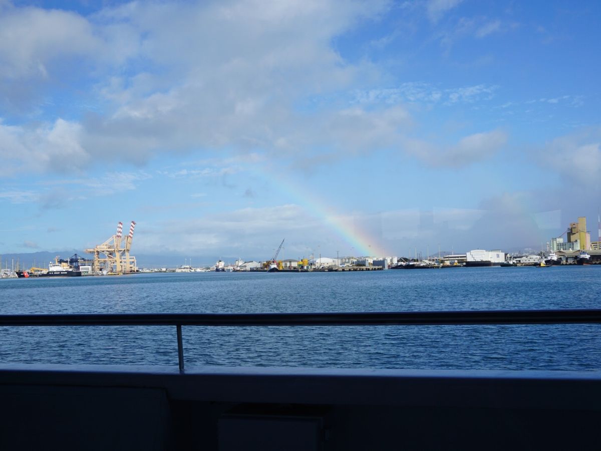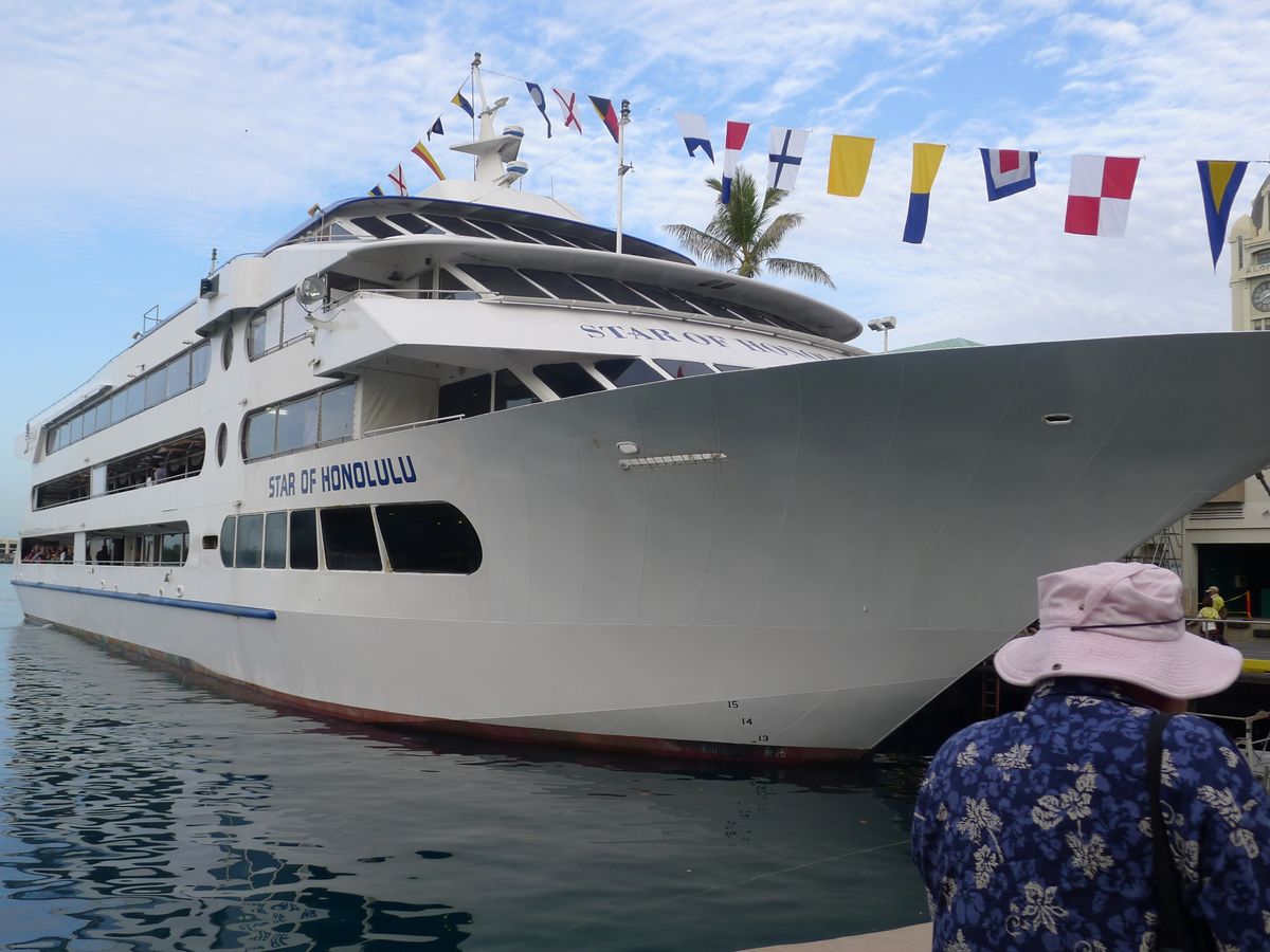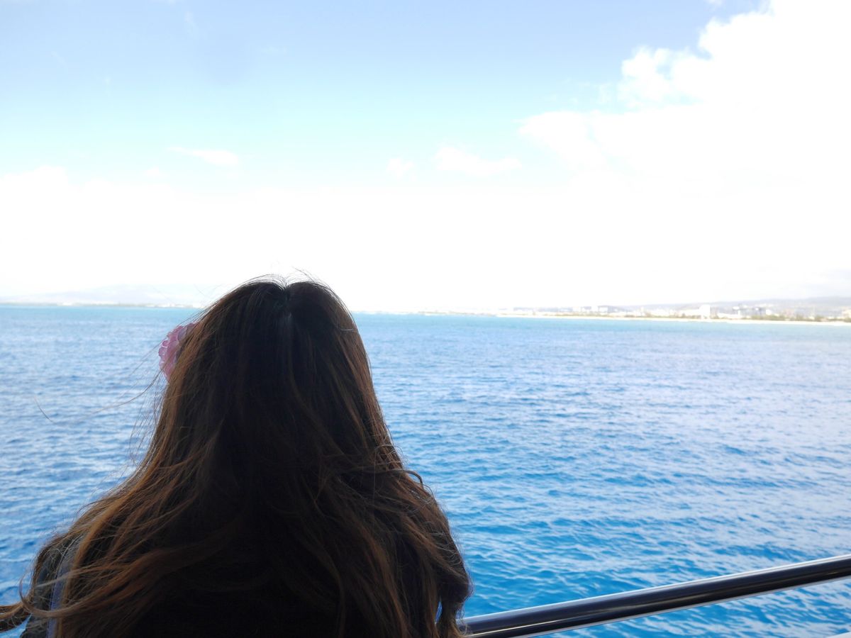 I participated in my first trip to Hawaii with my family. We took a taxi from our hotel in Waikiki to the pier, checked in, and boarded the ship! I was a bit anxious about the language barrier since everything was in English, but there were Japanese announcements, so I didn't have much trouble. There were quite a few Japanese guests as well. The cruise started in the morning with great weather, and since we chose a plan without meals, we stayed on the top deck enjoying the sea and the scenery. As for the whales... we saw them! We could see the spouts and dorsal fins every few minutes, and it felt like we were cruising alongside them, which was very pleasant; I wanted to keep watching. I also hope to see them jump next time!