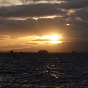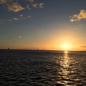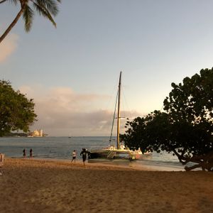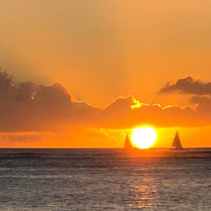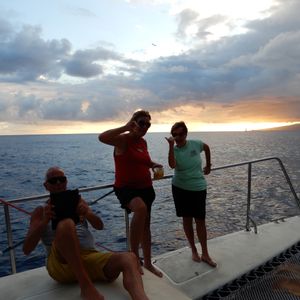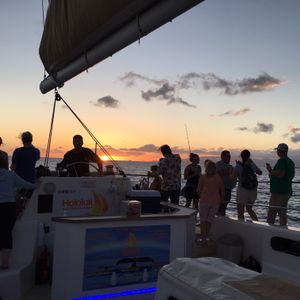 アウトリガーリーフの砂浜のテントで5:00受付、5:20に再集合して裸足で船に乗り込み出発。ベンチの後ろに荷物とサンダルを置くスペースあり。飲み放題の飲み物は、マイタイ、ビール、スパークリンク、ワインなど。沖に向かってどんどん進んでいきます。座っていてもつまらないので、前の方に立ってました。するとものすごく揺れます。でもそれが楽しかった!船に弱い人は無理かも。日本人は私たち夫婦と女の子一人だけ。英語が喋れなくても十分楽しめました。途中ダイアモンドヘッド方面に虹が!すごくきれいでした。先端の方は波が来るので濡れます。楽しすぎて何時夕日が沈んだか分からない位…雲が多かったのであまり気にして見てませんでした。海とお酒が好きで船が大丈夫な人にはお勧めです。