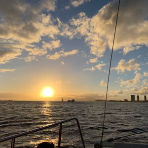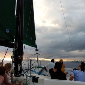 First time for a friend of mine visiting from arizona. Crew was very helpful, attentive and friendly. Overcast day but the cruise was very enjoyable. To many people booked not enough seats for everyone plus alot of little children. Many people got sick so we had to watch all these people vomiting...not pleasant at all. The crew and captain were very personable helpful and attentive. Drinks flowed and music was pleasant. All participants were interacting and the seas were a bit choppy but not too bad. Overcast evening so not much of a sunset experience.