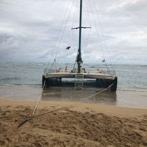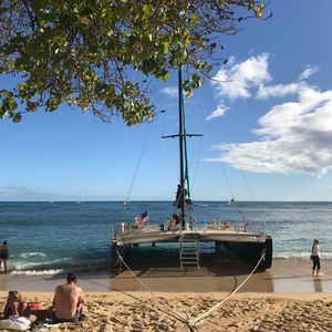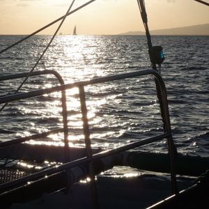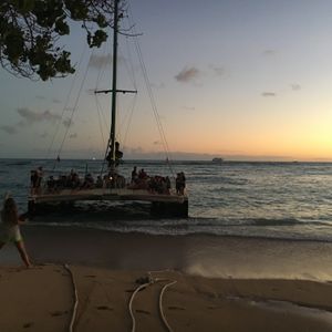 サンセットセーリングなのに、何かの都合(満潮?)で出航が少し遅れて、結局ビーチから眺める羽目になってしまいその点は残念でしたが、金曜のセーリングだったので、ヒルトン沖の花火も目の前で夜景とマッチして最高でした!また、アルコールを飲みながら聞くキャプテンの盛り上げ演出がグッドでした!
