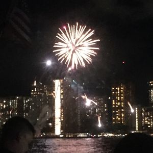花火をみることができ、ホノルルの夜景も満喫し、それは最高でした。ただ、寒かったです。3月、夜の海にひざ下まで浸かり乗船し、船の中は裸足。夜の海風をモロに受けて、下船するころには体が冷え冷えでした。厚めの上着持参、乗船前にトイレ、なるべく水分は控えめにすると、より楽しめると思います。