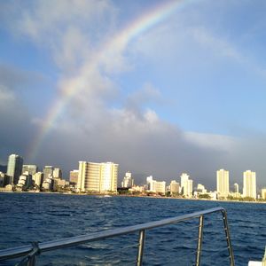 Oahu is currently in the rainy season. It drizzled several times on the day of our outing, but we were able to set sail without any issues. When I glanced towards Waikiki, I encountered the miracle of a large rainbow stretching from the Waikiki hotels to Diamond Head!