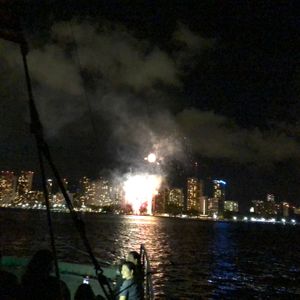 Previously, I boarded the Mai Tai Catamaran to see the sunset sinking on the horizon. I was moved then, so this time I boarded to watch the Friday fireworks at Hilton. Since Hilton Village is my regular accommodation, I had been watching the Friday fireworks from the beach and poolside in front of Hilton Village, but seeing the fireworks from the sea was something special. I sat on the port side, but when we started moving, I realized we were facing the opposite side of the beach and thought I might have made a mistake. However, we stopped facing the fireworks venue, so I had a good view. If you sit close to the bow, prepared to get splashed by the waves, you can see the fireworks well. The crew only spoke English but were kind. Because of that, I ended up drinking quite a bit—Mai Tai, beer, and white wine—and then I needed to go to the restroom, which was a bit of a problem. Upon closer inspection, I noticed there was a window on the port side, and when I went to check it out, I found that it was the restroom.