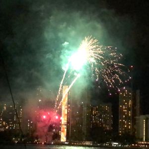 以前、水平線に沈む夕日を見にマイタイ・カタマラン号に乗船しました。その時も感動しましたので、今回はヒルトンの金曜花火を見るために乗船しました。ヒルトンビレッジが常宿なので金曜花火はヒルトンビレッジ前の浜辺やプールサイドから見ていましたが、海上から見る花火はまた格別でした。左舷の席に座りましたが、走り出すと浜辺と反対側と気づき失敗したかなと思いましたが、花火会場に舳先を向けて止まったのでよく見えました。波を被るのを覚悟で舳先近くに座れば花火がよく見えます。クルーは英語しか話せませんが親切でした。そのためマイタイ、ビール、白ワインと結構飲んでしまいトイレに行きたくなり困ってしまいました。よく見ると左舷に窓があり、そこに潜る人を見つけ、見に行くとそこがトイレでした。