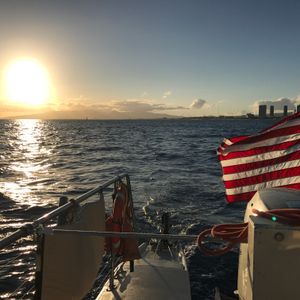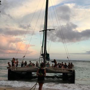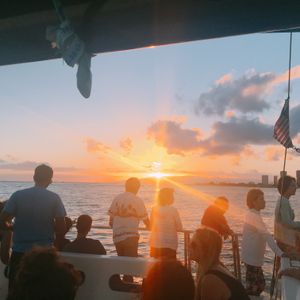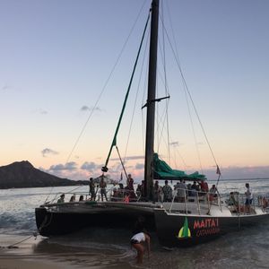 The pleasant sea breeze of Hawaii, the shimmering Diamond Head at sunset, and a cruise while sipping on the original Mai Tai was the perfect way to wrap up our trip. My sister, my daughters, and I participated, and it was everyone's first yacht cruise, but everyone loved it. The original Mai Tai on the Mai Tai Catamaran was as delicious as the crew boasted, and everyone had multiple drinks. About 30% of the participants were Japanese, but everyone was cheerful and having a great time. As the reviews said, the cost performance is very good. For attire, we participated in locally sourced muumuu dresses, but since the wind lifted the hems, I think shorts would be less bothersome. We took off our beach sandals and went barefoot. We didn't get wet on the yacht, but when boarding, the hem of my dress got wet from the waves on the beach. That was fun too. Before boarding, they take group photos with Diamond Head in the background. They take really beautiful photos, so I recommend buying them. I definitely want to participate again on my next trip to Honolulu. The crew, who kept the atmosphere lively, was also great! I am looking forward to joining again!