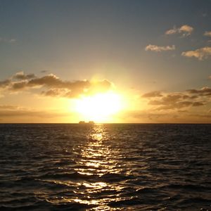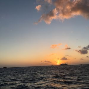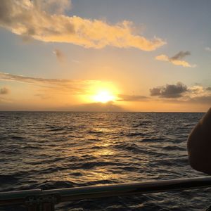 This is my fourth time in Hawaii, but it was my first time seeing the sunset from the ocean. I was worried that I wouldn't be able to see the sun setting because of the clouds, but just as the sun was about to set, the clouds parted perfectly, and I was able to see a beautiful sunset. I love the atmosphere of Hawaii, but this moment on the ocean gave me a different experience of Hawaii.