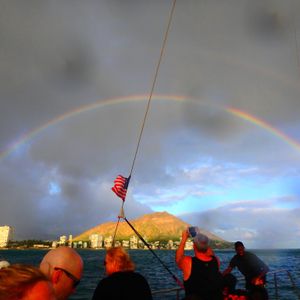 We had everything on our sunset cruise - a sun shower, a beautiful rainbow right over Diamond Head, a magnificent sunset and a full moon. We also had the amazing Dave and Philippe and a great bunch of fellow travellers. The drinks and the fun flowed! We'll definitely recommend this trip to family and friends. We'll be back for another cruise next time we are in Waikiki.