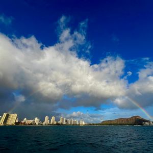 ハワイに到着した日の夕方にサンセットカタマランに参加しました。海へ出てすぐに、ダイヤモンドヘッドに虹がかかり、ワイキキの街と虹を海から見るという最高の祝福を受けました。サンセットも素晴らしく、海から見るワイキキは最高の思い出になりました。また参加したいと思うアクティビティです。