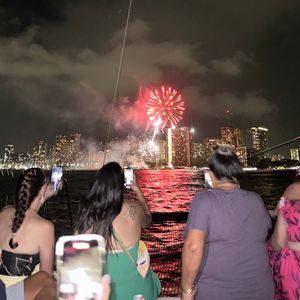 During the fireworks, cheerful music played, and everyone was excited, cheering loudly. After that, the boat slowly made its way towards Diamond Head, and the gentle night breeze felt pleasant on my skin. The dark silhouette of Diamond Head was overwhelmingly impressive, and the sparkling cityscape of Waikiki in the distance was beautiful. I was able to relax completely, filled with a sense of liberation.