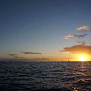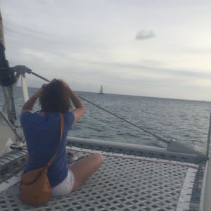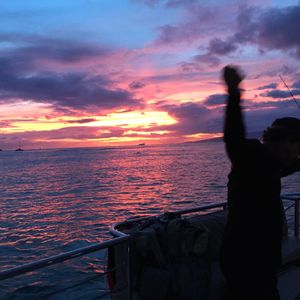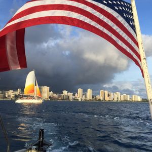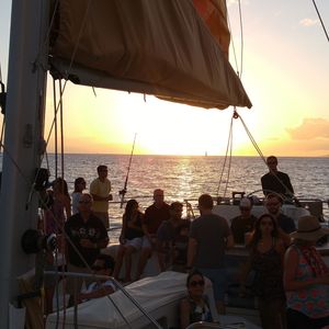 いつもディナークルーズを予約していたのですが、海の風景を見ずにクルージングが終わってしまうことに残念さを感じていました。そんな時にサンセットセーリングを見つけました。新婚旅行、旦那さんは初めてのハワイだし思い切って予約してみました。集合場所が分かりにくい所にあり事前に散歩がてら探しておいてよかったと思いました。シェラトンホテルとハレクラニの間の小道を入ると行けました。それ以外は日本人の参加者は私達を含め2組で他は外人です( *´꒳`* )元々海外に来たら日本人の少ない場所に行くのが好きなので抵抗もなく参加できました。マイタイが飲み放題なのも嬉しいですね!トイレもありますが、狭いと聞いたのでガブ飲みせず、ソフトドリンクも飲みながらサンセットと船の上からの景色を楽しみました。揺れはあります。波が高い時は立ってられないくらい揺れます。外人は立ってわちゃわちゃ動いてましたが、日本人は小柄なので座ってた方がいいですよ。サンセットの時刻には海のベストポジションでブルーの帆をひらいてエンジンを止めて帆だけで進むんです。目の前に広がるサンセット、ダイヤモンドヘッドを独り占め♡素敵なツアーでした。また参加します!