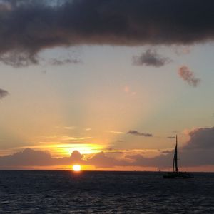 9/19に参加しました。毎日、朝夕に小雨が降る感じでしたが、夕陽が沈む前に山側に小雨が降り、虹が何箇所か出現!ダイヤモンドヘッド側の海上からも虹を見ることが出来ました。夕陽も綺麗でしたが残念ながらグリーンフラッシュを見ることは出来ませんでした。日本人は私達夫婦と新婚夫婦の2組みだけ。マイタイ他が飲み放題で船上はとても良い雰囲気で楽しかったです。