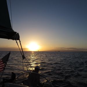 出航したときは厚い雲で覆われていてサンセットは無理かと思っていたら、太陽が沈むところだけ雲が切れて綺麗なサンセットが見れて歓声があがっていました!海から見渡すダイヤモンドヘッドはワイキキビーチから見るのとはまた違う景色でよかったです。たっぷり1時間半は海の上なので、寒さが心配な方は、ビーチタオルや羽織るものを持っていったほうが良いです。イスの背の中に荷物をしまうことができます。ちゃんとトイレの説明もあり、実際に使用している女性もいました。今回は山に日が沈む時期だったので、次回は海に沈む夕日を見たいです!