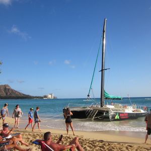 マイタイを飲みながら夕日を眺めて、皆さん思い思いに写真を撮ったりおしゃべりしたり。ワイキキのホテル群とダイヤモンドヘッドを眺め、振り返れば水平線に真っ赤な夕日。この日はほとんど揺れることはなかった。乗り降りの時に濡れるのでビーチサンダルがオススメ。VERTRAさんはメールでの直前確認や直後のお礼メールなど丁寧でした。アルコール飲料にパスポートが必要と書いてあるけど、全然要らなかったです。良い企画を有難うございました。