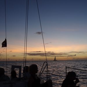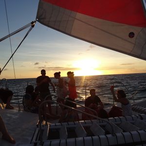 We participated as a couple. This sunset cruise offers unlimited drinks, and they serve Mai Tais as cocktails. The boat initially uses the engine to head out to sea, but once we are offshore, it sails solely with the sails. Since it was dusk, we enjoyed a very cool breeze, which was refreshing. I felt so good that I ended up drinking several Mai Tais. We were able to see the sunset clearly, and it was an unforgettable cruise experience.