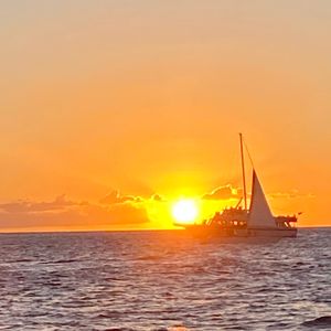 We departed from the beach in front of the Sheraton Hotel, just a stone's throw away from the hotel, about 80 minutes before sunset. The catamaran can accommodate around 20 to 30 people. We turned around after passing the beautifully illuminated Diamond Head at sunset. Cruising while sipping a Mai Tai and enjoying the sunset is an absolutely wonderful experience!