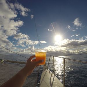 I go to Hawaii every year and was aware of the boats anchored at the beach, but this was my first time participating in this cruise. I've been on regular dinner cruises before, and the food wasn't great, but I wanted my husband to enjoy his first time in Hawaii, and since I love cruises, I decided to join. It was definitely the right choice. The weather was perfect, and on the boat, there was an all-you-can-drink Mai Tai, which I enjoyed since I love alcohol. There were also snacks provided. There were no Japanese people on board, just everyone from overseas. Everyone was very friendly, and we took pictures together while enjoying the sunset and even saw a rainbow. It was the best cruise. My husband said he really enjoyed it too, and since we could disembark in the evening, we were able to go for a delicious meal afterward, making the most of our time. It was fantastic.