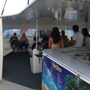 参加者の皆さんはかなりラフな服装ですので、パンツスタイルがお勧めです。湾に到着後、乗船券とドリンク券を引き替え、カタラマンに乗船!日本語の対応はなく全て英語の説明ですが、船にある救命胴衣の位置やトイレの場所はわかりました。ドリンクは出港するとすぐに開始!サイズは2種類ありますが、小さい方で充分。