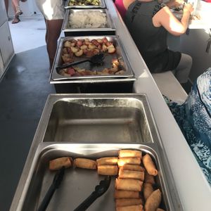 I participated in a Makani Dinner Cruise. Unfortunately, it was cloudy on the day of the cruise, but I was impressed by the atmosphere and the view. The dinner featured a plate of Hawaiian local cuisine with chicken, beef, potatoes, spring rolls, and rice, and it was very delicious. The only downside was the one-drink policy. If the lighting had been better, I think it would have been the perfect dinner cruise. This time, I joined with my beloved boyfriend, and it became a memorable day for both of us. The cruise was amazing, and I love my boyfriend!!