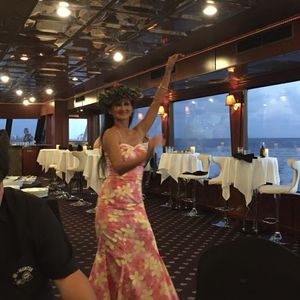 今回初めて参加しました。海外の雰囲気を感じたかったので、日本人が少ないこのディナークルーズを選びました。クルージングの中身については想像通りで、最初にビュッフェを楽しんであとはそれぞれ景色を見たり、バーでハワイアンダンスやハワイアンミュージックを楽しむ内容でした。料理の味は普通といったところ。