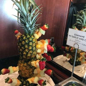 お料理は、焼き鳥、肉団子、ソーセージ、枝豆など数種類ありました。一番目を引いたのは、パイナップルに数種類の果物の串刺しが飾らせていたのが、印象的でしかも美味しかったです。