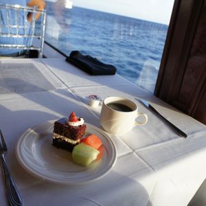 波があまりに大きく、停泊中の食事の最中