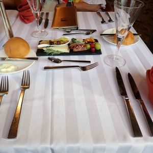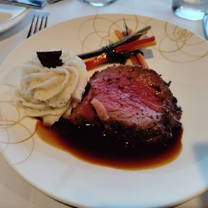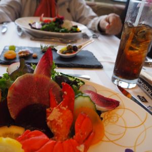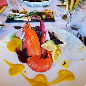 The upper deck was great for taking pictures. We started off with a charcuterie board that had tasty cheeses and fruit. The second course included lobster over a beet salad with a nice puree. My only reservation was the meat which was overcooked in my opinion, but to be fair, I'm sure many people prefer a medium-well filet. Taking pictures in between courses was a huge plus and didn't make us feel confined to the table. Overall, I would recommend this cruise to anyone looking for a good time.