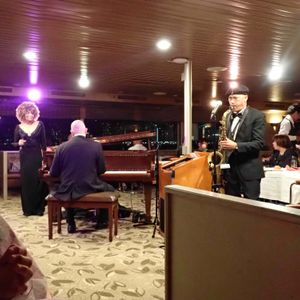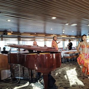 The evening started with a welcome Hawaiian dance, and the tables were decorated with rose flowers, setting the stage for a wonderful dinner to come. As we began, live piano music played swing jazz in the background. We had booked this dinner cruise to celebrate our 50th wedding anniversary. The ship's dedicated photographer created memorable photos for us, and before we left, we received them in an album. It was truly a memorable experience. The food was delicious, and we were able to enjoy a lovely time. Thank you very much.