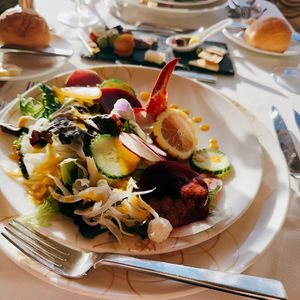 I chose the buffet course. To be honest, the food was just okay. There were items like yakisoba, and the main roast beef felt a bit thin. You have to pile salads and other dishes onto one large plate. Since there are quite a few customers, you're prompted to line up for the food in order of seating.