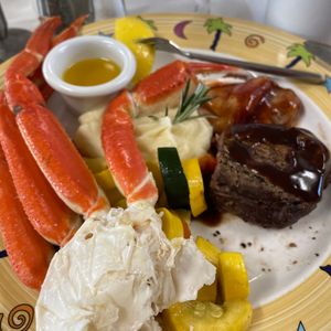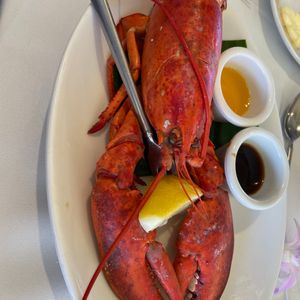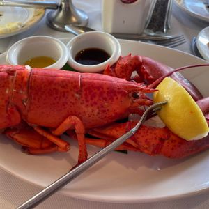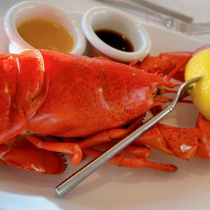 The main dishes include a whole boiled lobster and steak. The lobster was plump and delicious, and the steak was tender.