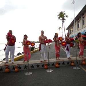 I was able to smoothly change my reservation from a regular cruise to the vow renewal plan. I took a taxi to the port with plenty of time to spare. If I had arrived earlier, I might have been able to wait in a cooler spot, but it wasn't too hot waiting in the shade. My family coordinated our outfits, which felt a bit embarrassing at first, but once we boarded, everyone was dressed up, so it felt normal after a while. The ship is divided into levels based on the plan you booked, and you attach a sticker from the ticket you receive during check-in to your clothing. Before departure, we enjoyed a hula performance at the port. The boarding process was smooth, and our table was already assigned. The staff member in charge of our table introduced themselves in a friendly manner. The meal was a crab plan, and they brought the dishes to our table in order, starting with the appetizers. We could freely order sparkling wine and juice. We were guided for photo opportunities at our seats, and they took commemorative photos that were delivered to us before disembarking.