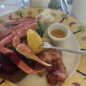 The weather was nice, and the breeze felt great. We saw the hotel and Diamond Head, enjoyed a beautiful sunset, and then had dinner. This time, I chose the buffet. There was plenty of food, and I was completely full.