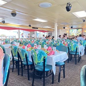 思ったより席がぎゅうぎゅうでびっくりしましたが、生ライブもありあっという間の時間でした。出航する前にメイン料理まで出てきたのでお腹を空かせて行ったほうがいいです!ナッツアレルギーだと事前の予約時と当日の2回伝えたのですが、食後のマカダミアナッツジェラートはそのまま出てきたので、アレルギーをお持ちの方はお気をつけください。金曜日に乗船し、天候にも恵まれたので花火も見ることができました。日本語は通じませんが、みんなで踊るYMCAも楽しかったです。当日入籍した方も乗船してて最後はほっこり。とても良い旅の思い出になりました!