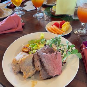The food, including salad, bread, lobster, steak, and dessert, was all very delicious, and the self-serve cheese and fruit were also tasty. We received tickets for two drinks per person, and we could choose alcoholic beverages; if we wanted more, it would cost extra. Coffee or tea was provided as a complimentary service. The servers and other staff were friendly and had a pleasant demeanor.