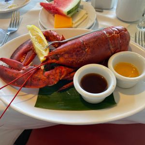 The main dishes include a whole boiled lobster and steak. The lobster was plump and delicious, and the steak was tender.