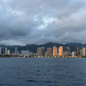 The dinner is buffet style, and there is quite a variety and quantity, but I think you shouldn't expect much in terms of taste. Alcoholic beverages are extra. The boat departs in the evening, and it was still bright until we headed out to sea. Fortunately, we were able to do some whale watching. I enjoyed the sunset and the lights of Waikiki after the sun went down.