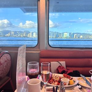 17年ぶりのディナークルーズ(食べ放題+ライブショー)に4人で参加しました。ウエルカムマイタイから始まり、食事もローストビーフをメインにサラダ、副菜など沢山出ていました。途中でキャプテンが席まで来ていただき記念撮影をしていただきました。そろそろ食事も終わる頃からポリネシアンダンスショーが始まり、お客も参加して大いに盛り上がりました。また船上から見るワイキキはとても美しくハワイらしさを感じたひと時を過ごすことが出来ました。そして、スタッフの皆さんはとてもフレンドリーでした。有難うございました。