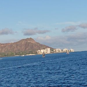 快晴 クルージング最高の日 沢山のお客さんが乗船してエキゾチック感も高まりました。安心で分かりやすい乗船。バスで港に行くのですがその運転手さんも分かりやすいガイド、説明をしていただいた。海上から眺める風景、ダイヤモンドヘッド、夕陽、他の船、自分たちのホテルなど 大変新鮮でした。