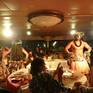 The fish dishes and chicken were delicious, and the roast beef was excellent. My sixth-grade child ate a lot and enjoyed watching Hawaiian dance, dancing together, and taking plenty of photos on the deck. Unfortunately, it was drizzling, but we had a great time and I’m glad we participated.