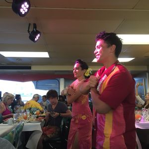 二時間のクルージング中ずっと生演奏やショーが目の前で行われていました。スタッフはみなさん笑顔であふれていて幸せな時間でした。ブュッフェの料理は少し残念でしたが夕焼けやダイヤモンドヘッドの景色は最高でした。