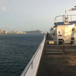 I was surprised by the larger-than-expected ship! The meals and attractions were satisfying. There was no announcement for sunset time, so I left my seat on my own, but it became a very memorable experience. The dynamic sunset and the orange-tinted Honolulu city and Diamond Head, which you can't experience on Tokyo Bay or Yokohama cruises, are definitely worth seeing.