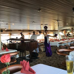 I participated in the reasonably priced buffet type. There weren't many Japanese people, and there were a lot of lively Latin individuals. I had pre-ordered red wine, so ordering just a Mai Tai for drinks was sufficient. The food was better than I had imagined, with plenty of delicious roast beef available, and I was able to eat a lot. However, the atmosphere and shows on the upper deck are a bit different, so for those who want to create special memories, the course option would be better, while the buffet type is great for those who prefer a casual, lively experience! In the end, everyone joined in for a dance with the Latin vibe, and it was a lot of fun.