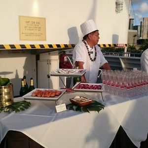 Upon arrival at Aloha Tower Pier, you will be guided to the top deck, where the captain and crew are waiting to treat you to a Hawaiian Belini toast and seasonal appetizers. A sophisticated way to start off an elegant evening at sea.