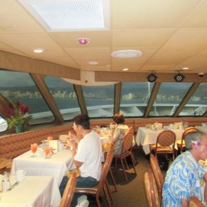 ハワイ到着日の夕刻に乗船しました。ゆったりとしたクルージングで旅の疲れも癒されました。食事はそれなりでしたが、クルーズスタッフは最高!!ウクレレを持った陽気なオジサン。男前と美女のハワイアンダンサーたち、我々お客を楽しませようと本当に一生懸命していただきました。会場は下船時間を迎えても大盛り上がりの楽しいひと時でした。